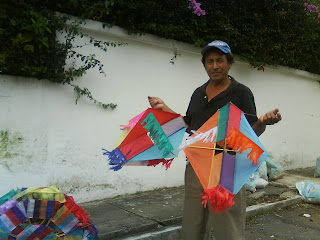 Con el fin de las lluvias, y el inicio de los vientos de fin de año, empieza la temporada de barriletes en Guatemala. Este hombre lleva unos hermosos. Los redondos y octagonales, tan tradicionales, están abajo a su derecha; mientras que en las manos lleva unos más elaborados.