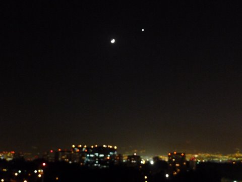 La Luna, sobre la ciudad de Guatemala, está hermosísima; y está en conjunción con un planeta. Mientras averiguo cuál planeta es, aquí se las dejo para disfrutarla, gozarla y saludarla.