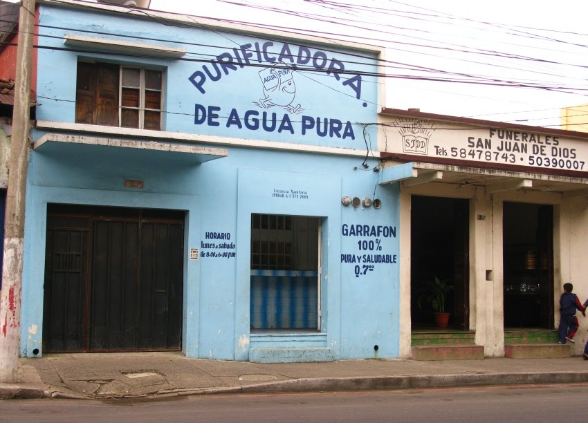 Purificadora de agua pura, negocio que está frente al Hospital San Juan de Dios, en la Avenida Elena…y al lado de una funeraria. Me encanta todo el concepto. El otro negocio que debería haber al lado de la funeraria es una carnicería. Una cuyo nombre fuera La confianza.