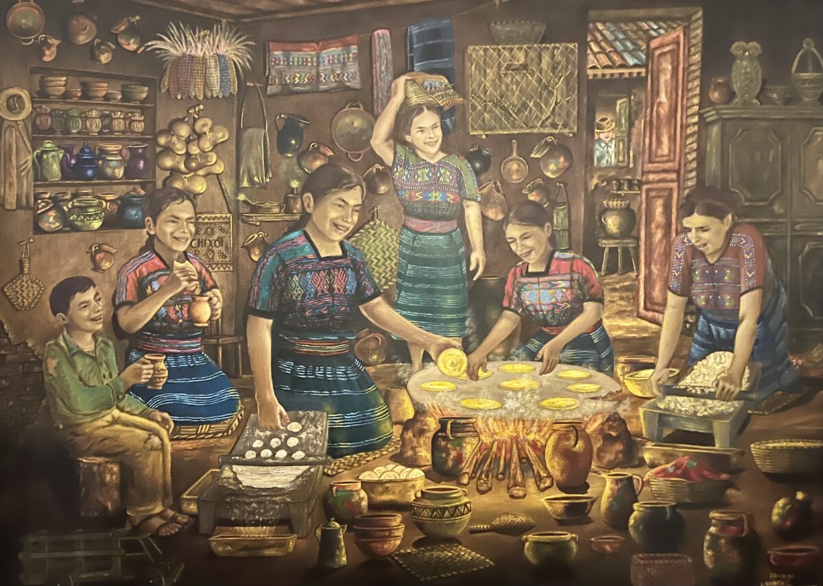 Cocina comalapense de antaño, de Iván Gabriel, fue la obra que más me cautivó en mi visita a Momentos, la exposición-venta de arte organizada por el Patronato para la Restauración del Antiguo Convento de Santo Domingo en la ciudad de Guatemala. En esa reunión alegre plasmada por el artista, se sienten el calor humano y el fuego del comal, acompañados por el aroma de las tortillas recién echadas. Como si fuera una escena de película, imagino que, poco antes, el niño de la izquierda volvió con hambre tras andar poray, viviendo las aventuras propias de su edad. Al rato, seguro entran los hombres de la familia para disfrutar del pepián y el atol que están calientes en las ollas.