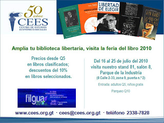 Si quieres leer más sobre la filosofía de la libertad, ¡esta es una buena oportunidad! El Centro de Estudios Económico-Sociales participará en Filgua 2010. Habrá libros con precios desde Q5, así como descuentos de hasta Q10. Conoce más sobre el pensamiento de gigantes como Ayn Rand, Ludwig von Mises, Friedrich A. Hayek, Federico Bastiat, Manuel F. Ayau y otros. Conócelos de primera mano para que no te digan, para que no te cuenten, para que no te mientan.