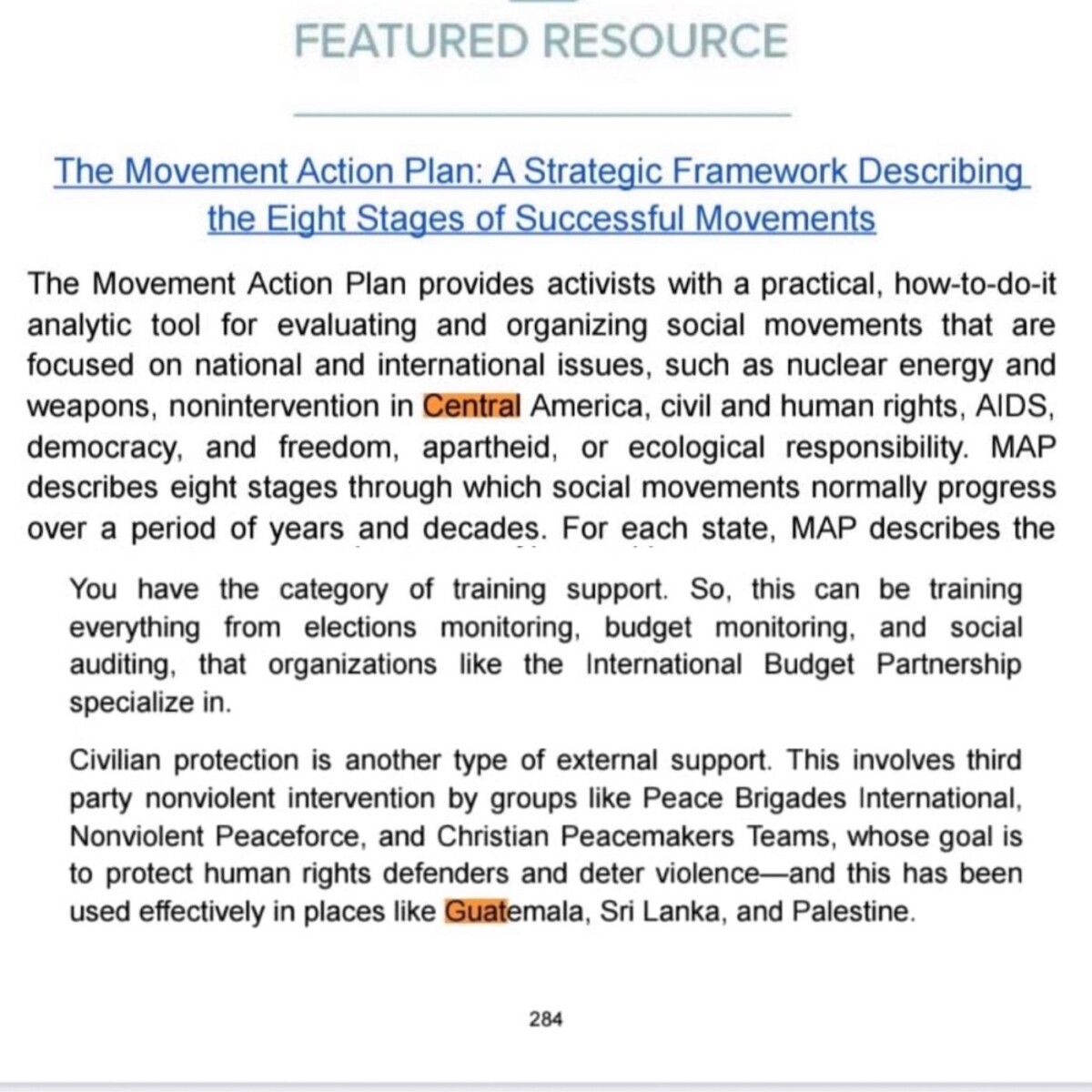 Muchos movimientos sociales de Guatemala, especialmente los nacidos durante el enfrentamiento armado interno entre 1960 y 1996, se entrelazan directamente con las guerrillas marxistas —como el Ejército Guerrillero de los Pobres y la Unidad Revolucionaria Nacional Guatemalteca—, de modo que el Plan de Acción de Movimientos se ve significativamente desnaturalizado. El MAP está diseñado fundamentalmente para estrategias no violentas, pero los bloqueos de calles y carreteras no califican como acciones no violentas, porque impiden el paso por medio de amenazas e incluso actos violentos; las invasiones tampoco califican, ni la destrucción de propiedad privada o estatal, y estoy seguro de que la toma de rehenes tampoco.