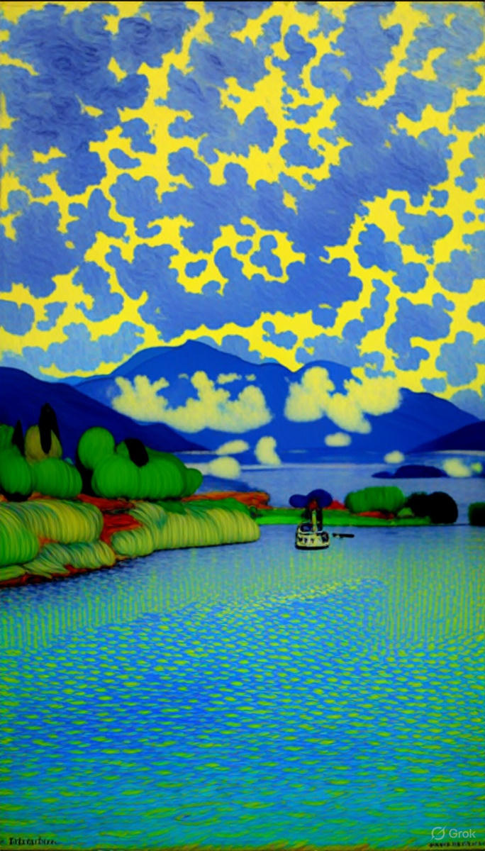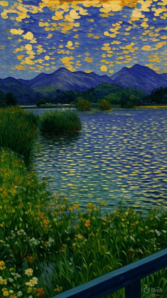 Lago de Amatitlán interpretado por Grok , con base en una foto mía, en el estilo de Claude Monet.