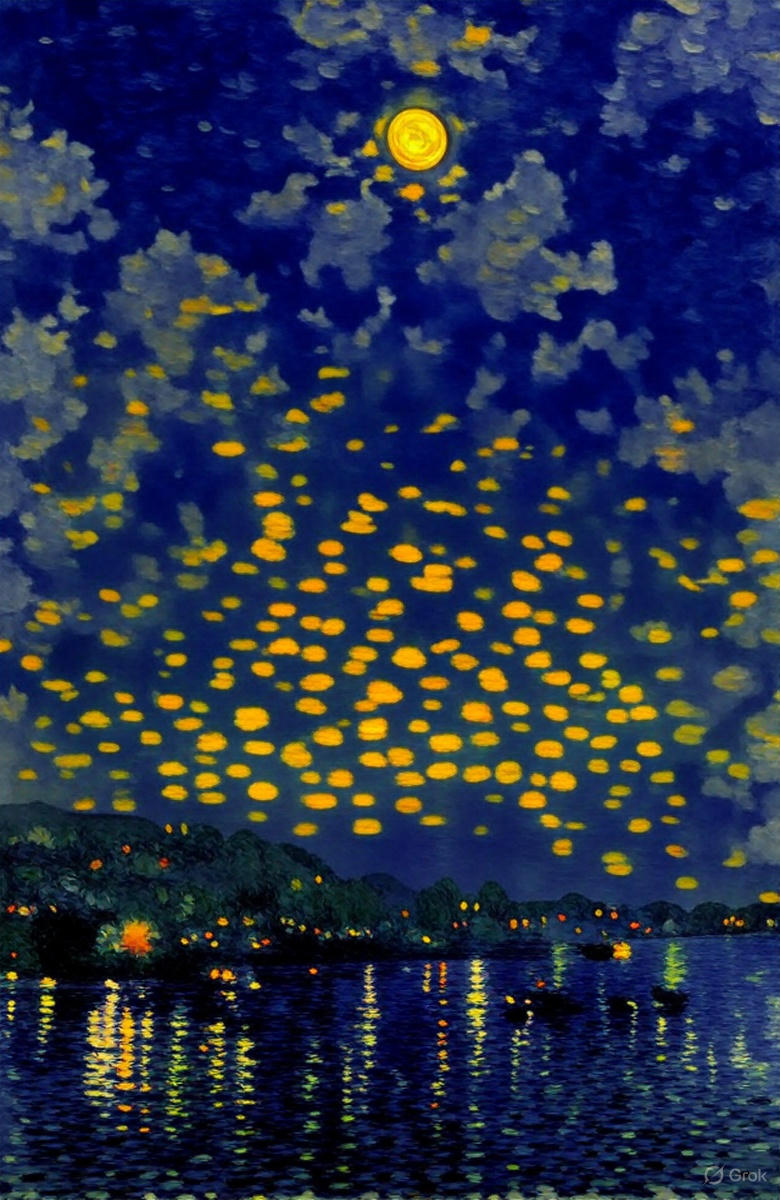 Lago de Amatitlán, de noche, interpretado por Grok en el estilo de Claude Monet.