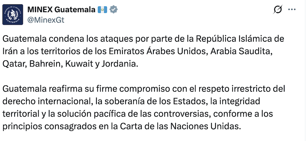 La administración semillera/raicera de Guatemala se apresuró a apoyar al mal. El Ministerio de Relaciones Exteriores indicó que el Gobierno de Guatemala expresa su profunda preocupación ante la escalada bélica e instó a los involucrados a tomar en consideración el derecho internacional y ejercer su máxima moderación para evitar mayores daños en infraestructura y, principalmente, vidas humanas. Cómo si el llamado derecho internacional hubiera hecho algo por los asesinados desde enero, por las mujeres vejadas y deshumanizadas, o por los gays ejecutados a manos de los esbirros de Jamenei. Como si las vidas de los millones de iraníes aplastados por la República Islámica desde 1979 no tuvieran valor alguno.