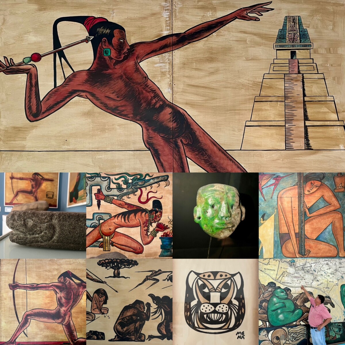 En el museo hay muestras de alfarería y lítica. Hay varias piezas sorprendentes y encantadoras. Los murales de Grajeda Mena que hay en el museo le hacen justicia al talento de aquel artista extraordinario. Mena, como él firmaba sus obras, dejó allá un legado hermoso. Su dominio de la figura humana estilizada y en movimiento capta inmediatamente la atención del observador. El propulsor de dardos, por ejemplo, me conectó con el David de Miguel Ángel y con el Arquero de Walter Peter, porque el personaje parece estar pensando, preparándose física y mentalmente para lanzar su arma. Ve su objetivo y calcula cuánta fuerza necesita para dar en el blanco y toda su mente y su cuerpo se concentran en conseguir el propósito que se ha propuesto.