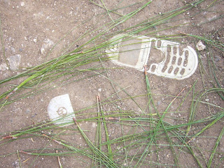 Lo que una vez fue una elegante, bonita y moderna carátula de teléfono móvil ha terminado sus días de gloria, y yace incrustado en el piso de tierra. Como yo crecí tiempos en los que había un sólo modelo de teléfono fijo, y no más; a mí me maravillan toda esta diversidad de aparatos y carátulas que hay ahora.