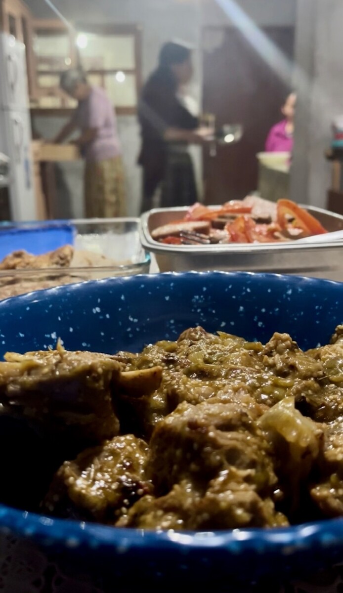 Para la cena, la tía Norma y la prima Marlin se lucieron con un plato tradicional: el chirmol de coche. Una exquisitez de carne de cerdo dorada y aderezada con un chirmol de miltomates y cebollas preparado con la grasa del chancho. No exagero si digo que hubiera querido lamer el plato y traer conmigo un trozo de aquella maravilla. Lissa, Raúl y yo llevamos ensalada de bolovique y unos queiquitos de banano con miel.