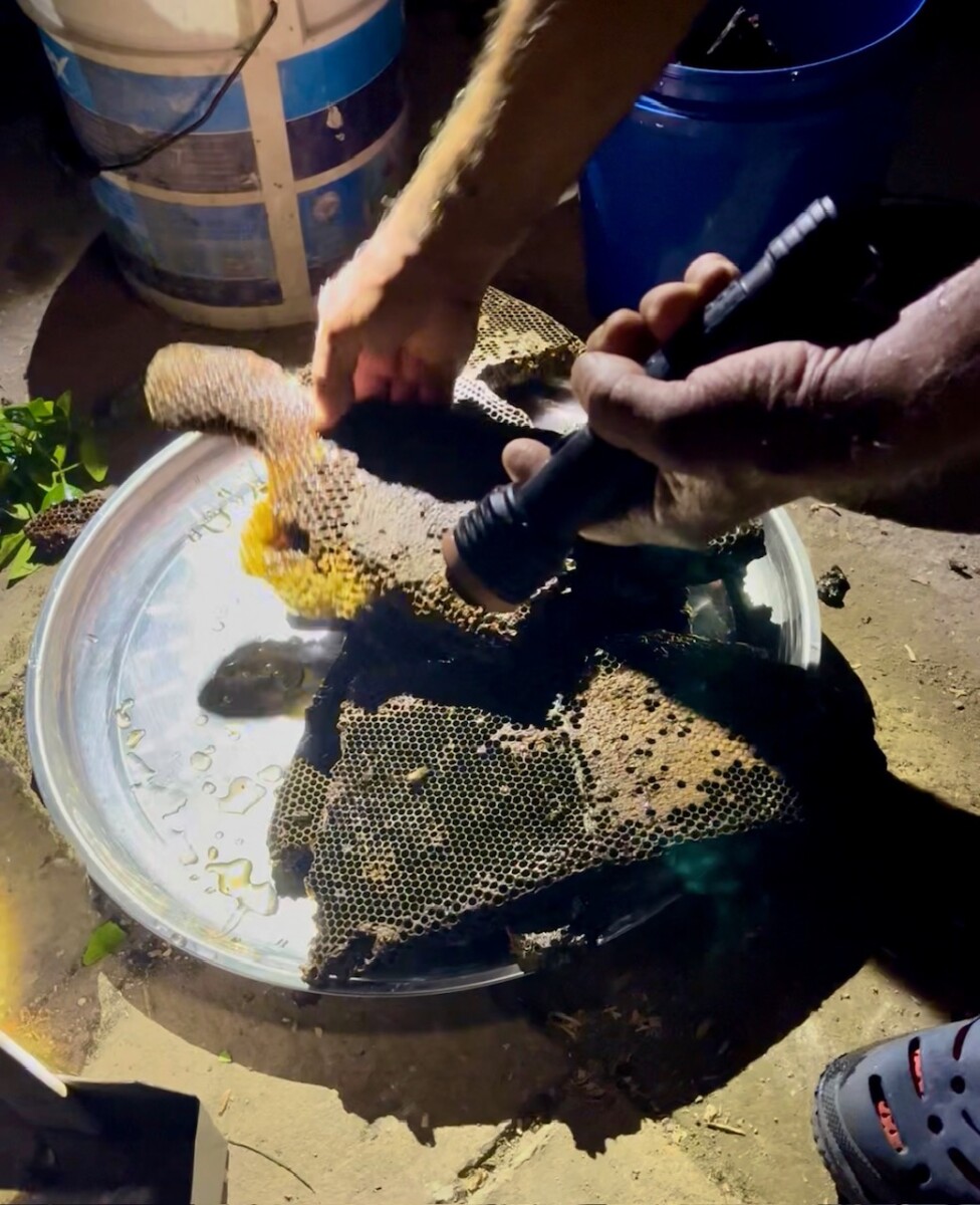 En apicultura, castrar significa retirar los panales para extraer la miel. Aunque en este caso también significó deshacerse de la colmena. Este fue un procedimiento necesario porque las abejas pueden ser muy peligrosas para los visitantes y para los habitantes de la finca.