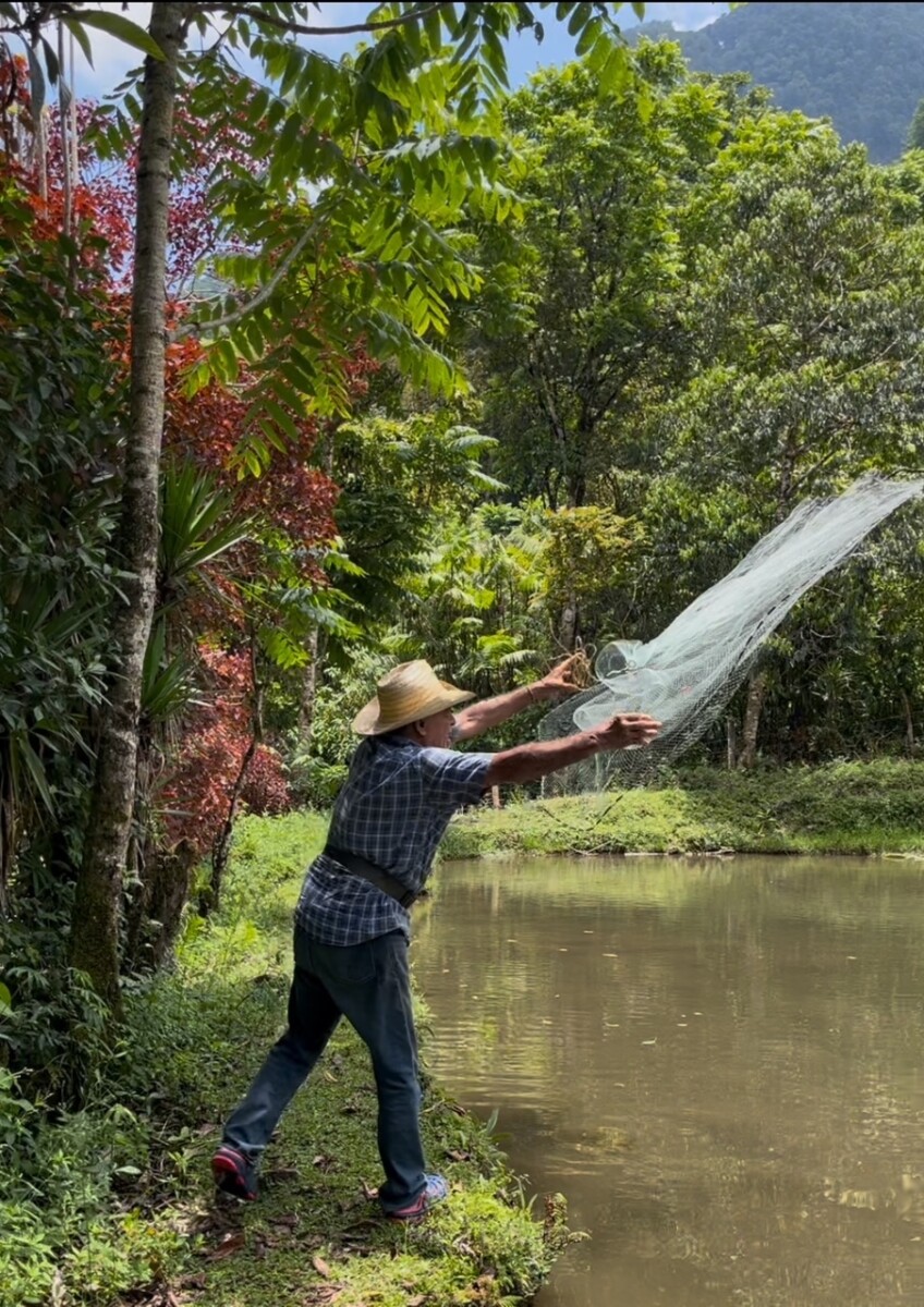 En fin, la cosa es que las mojarras comen rico. El año pasado, don Julio nos ofreció mojarras para almorzar, o cenar; pero como llevamos comida, no se dio la oportunidad. Sin embargo, este año reservamos el almuerzo del lunes para probar las mojarras y acompañamos a don Julio a pescarlas. Procuramos no estorbar y la pesca fue buena.