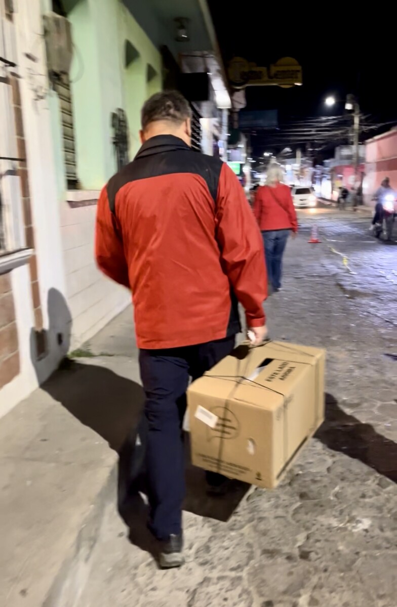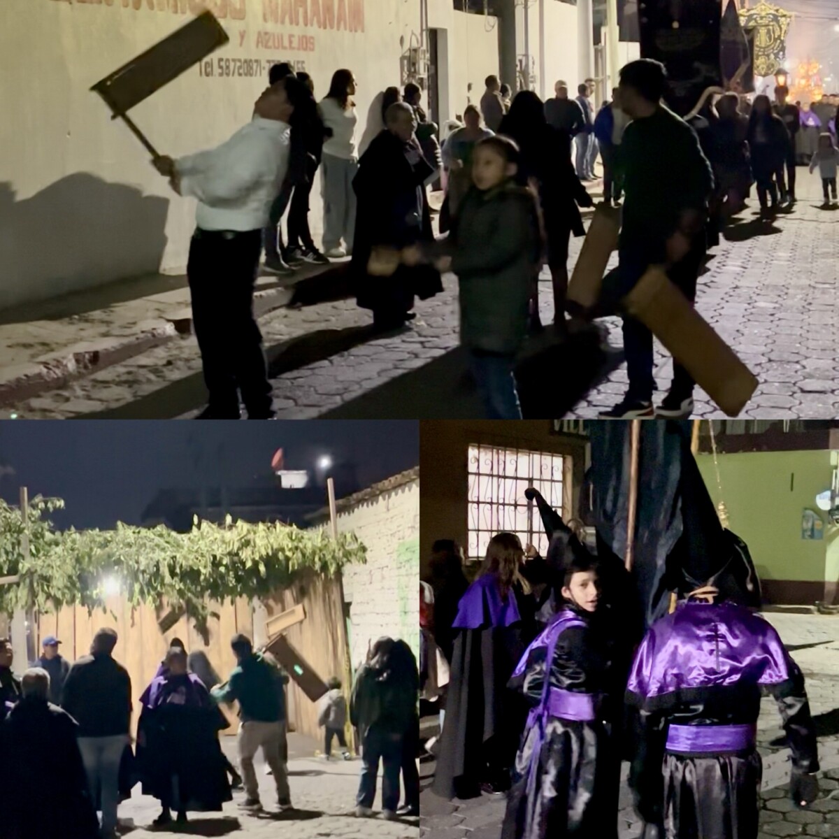 Ya con nuestra caja de pan bien amarrada, tomamos un tuk tuk que nos llevó al hotel. Ahí, junto a la chimenea, tomamos un par de tequilas, cenamos, hicimos el debriefing del día y Lissa se fue a acostar, en tanto que Raúl y yo nos dispusimos a caminar por la ciudad. No tuvimos que andar mucho cuando nos encontramos una procesión encantadora. Primero, por la forma particular de los capirotes de los cucuruchos y, segundo, porque iba precedida por matracas. Matracas pequeñas y matracas grandes. En la ciudad de Guatemala nunca las he visto en procesiones, pero resulta que, en otros lugares del país, todavía se usan estos instrumentos de madera que emiten sonidos fuertes y francamente desagradables; pero que son muy impresionantes en la noche y en medio de nubes de incienso.