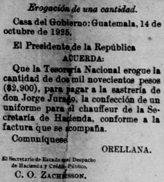 Que la Tesorería Nacional erogue la cantidad de dos mil novecientos pesos ($2900), para pagar a la sastrería de don Jorge Jurado, la confección de un uniforme para el chauffeur de la Secretaría de Hacienda, conforme a la factura que se acompaña, acordó el presidente José María Orellana el 14 de octubre de 1925 y la publicación fue refrendada por el secretario de estado en el despacho de Hacienda y Crédito Público, Carlos O. Zachrisson. Publicado el 24 de octubre de 1925 en El Guatemalteco.